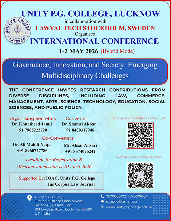 Unity P.G. College, Lucknow, also holds the distinction of being the first law college in Lucknow to have introduced the B.A. LL.B. (Hons.) course, marking a significant milestone in legal education in the region. Over the years, the college has gone from strength to strength and has emerged as a premier law institute and one of the top colleges in Lucknow. Its flagship programmes – LL.B. and B.A. LL.B. (Hons.) – have consistently produced competent and ethical legal professionals with a strong sense of social responsibility.